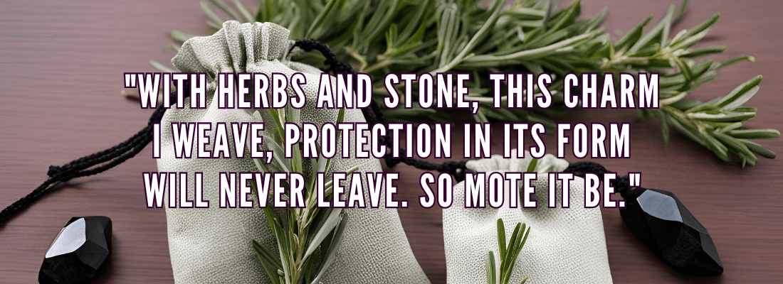 “With herbs and stone, this charm I weave, protection in its form will never leave. So mote it be.”